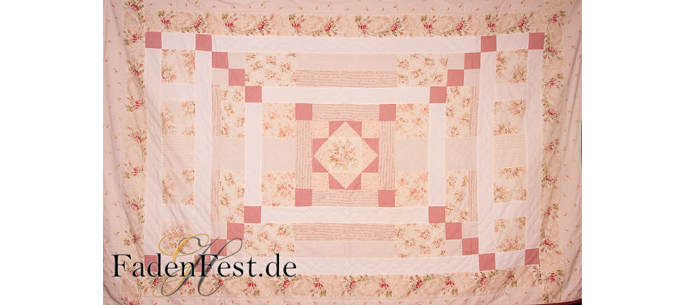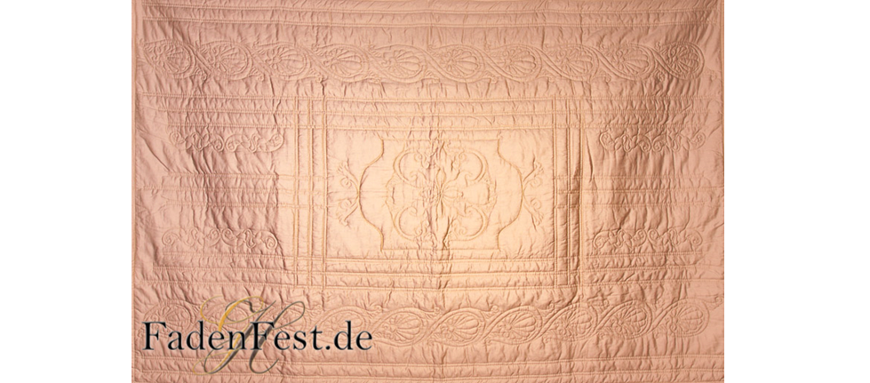 Viele Details und Muster sind von mir selbst designt. Mit Perlen und Spitze oder durch eine ganz besondere Faltentechnik verzaubert. Sie werden mit abgestimmten Baumwollstoffen genäht und durch unzählige Quiltstiche in Handarbeit verziert. Nicht überladen, weil sonst die drei wärmenden Schichten ihr Volumen verlieren und das Gesamtwerk einfach nur nach viel Arbeit ohne Gefühl erscheint. Weiches Volumen bringt Anschmiegsamkeit. Ich hab schon viele Quilts berührt und dabei manchmal gedacht: das ist ein tot-gequiltetes Etwas. "Eine schöne Platte". Aber günstig... Und die möchte ich nicht auf mir haben.. Ich möchte die handgenähten Stiche sehen, die so lebendig wirken, weil sie keiner Maschine bedurften. Sie lockern das gesamte Werk auf und - so soll es sein.