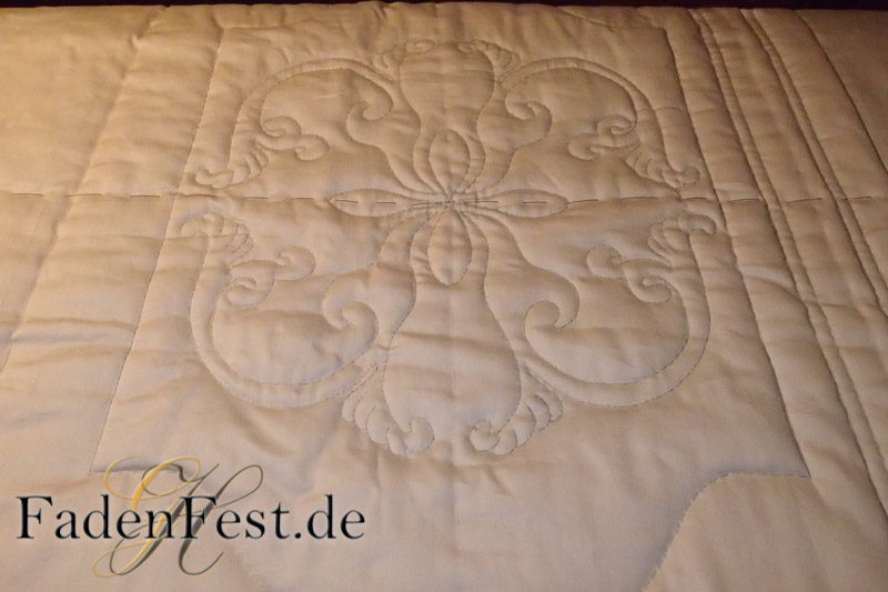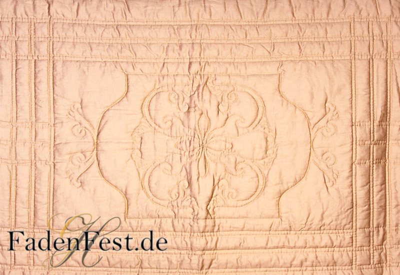 Dieser Quilt besteht aus nur einem Stoff, der in vorher exakt zugeschnittenen, verschieden großen Stücken wieder zusammengenäht wurde. Ein goldenwarmer Schimmer mit wundervollen, fast schon orientalischen Temperament. Es war eine Herausforderung für mich. Und ich freu mich auf die nächste.