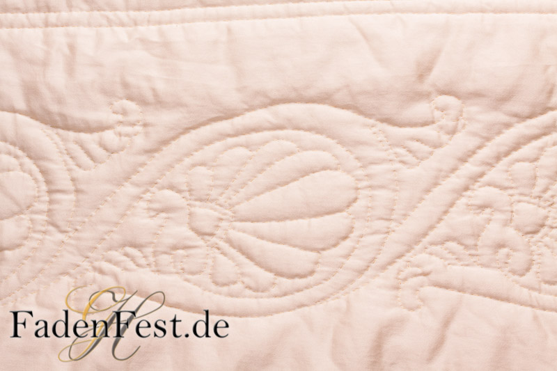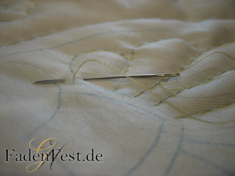 Die Muster zeichne ich auf den Stoff auf, um sie dann mit unzähligen Stichen per Hand durch die drei Lagen, festzuhalten.