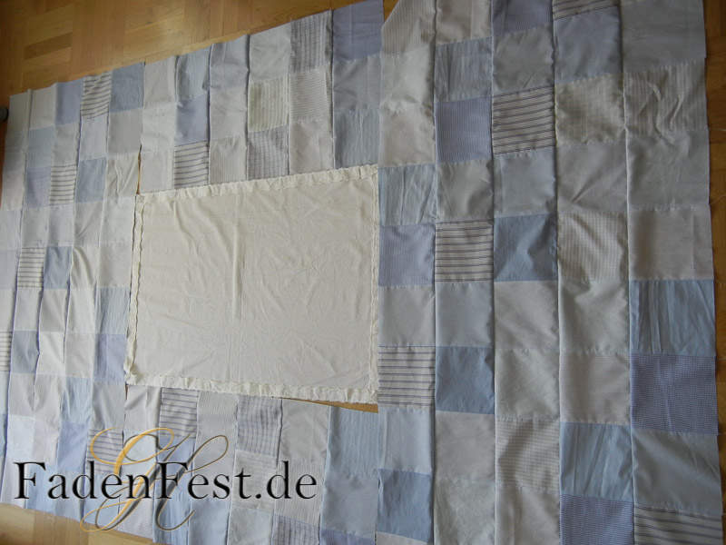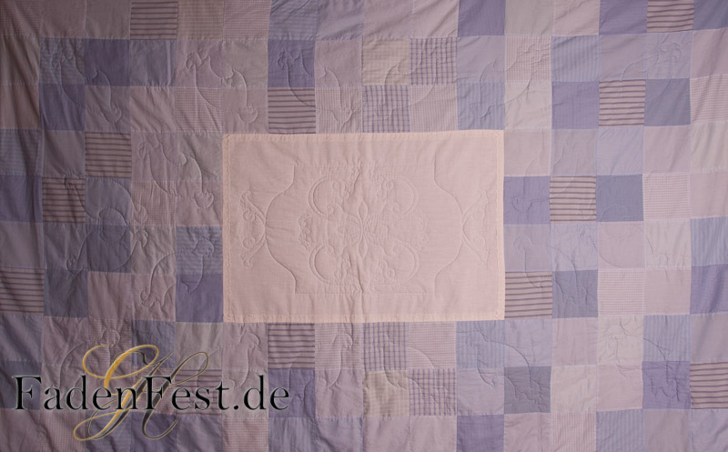 Das Nähen hat mir so viel Freude gemacht, dass gleich zwei davon entstehen sollten. Sanfte blaue Baumwollstoffe harmonieren miteinander. Damit der Quilt nicht ganz so kariert daher kommt, habe ich im Mittelteil als Highlight einen weißen Stoff eingesetzt, diesen mit einem Ornament in Handarbeit gequiltet und mit einer alten wunderschönen weißen Baumwollspitze umsäumt.