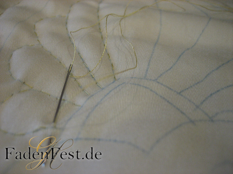 Die zusammen gehefteten Stoffe hängen über meinem Bügelbrett und sind tapfer bei jedem Stich.