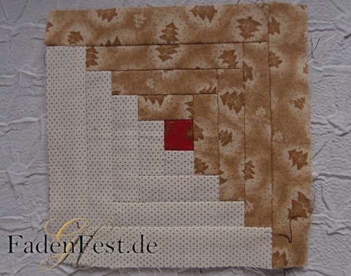 Thema Log Cabin mit Weihnachtsmotiv. Ziel: mit exakt zugeschnittenen Stoffschnipseln und bügeln und geraden Nähten und bügeln ein Bild zu vollenden.